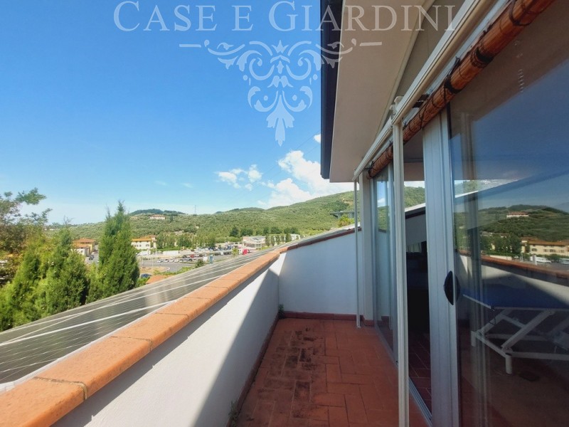 Al piano principale si apre una zona giorno importante: soggiorno con termocamino, terrazza abitabile panoramica, cucina separata con veranda di collegamento e zona notte con due camere e bagno.
