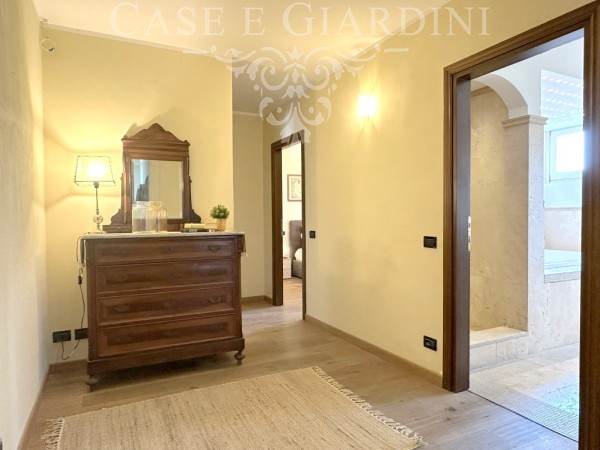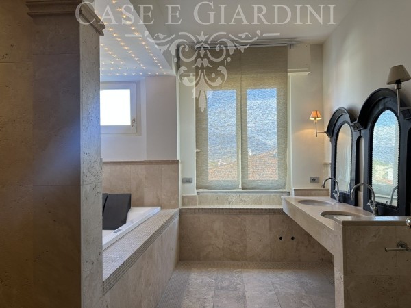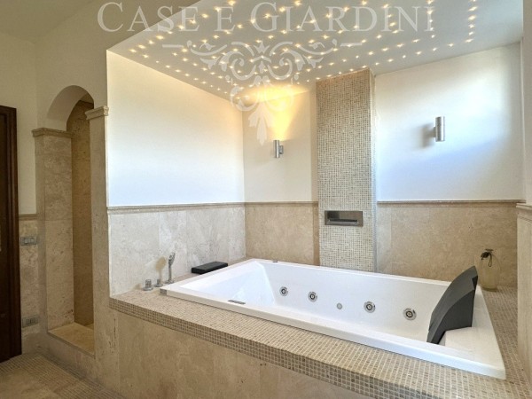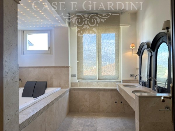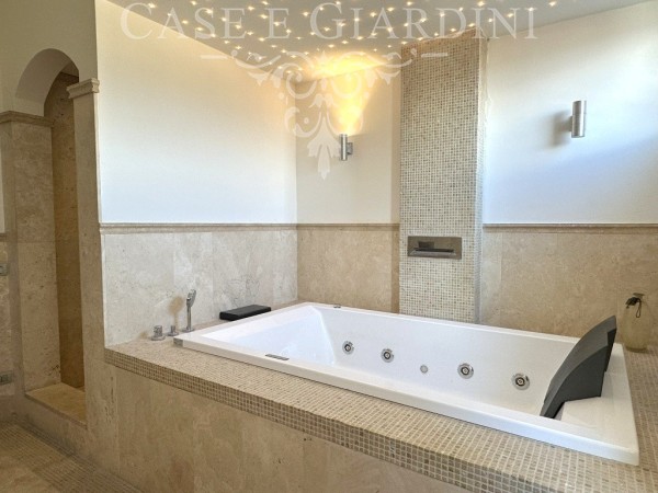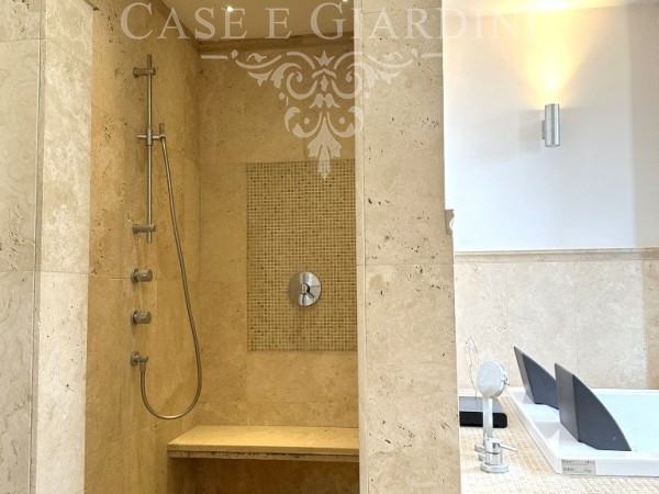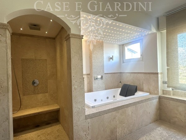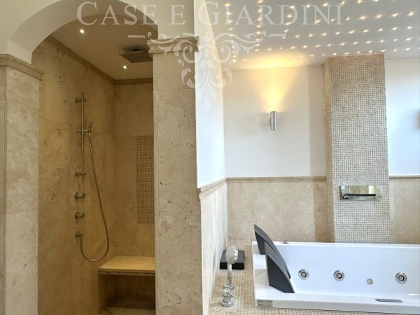 Il bagno in marmo travertino, decisamente ricercato, è uno dei punti di forza della casa : dispone di doppio lavabo, grande vasca idromassaggio per due e doccia, offrendo uno spazio di vero comfort quotidiano.